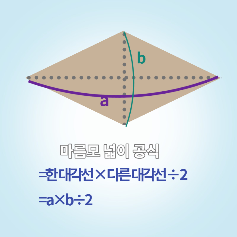 - 넓이 : 한 대각선 × 다른 대각선 ÷ 2